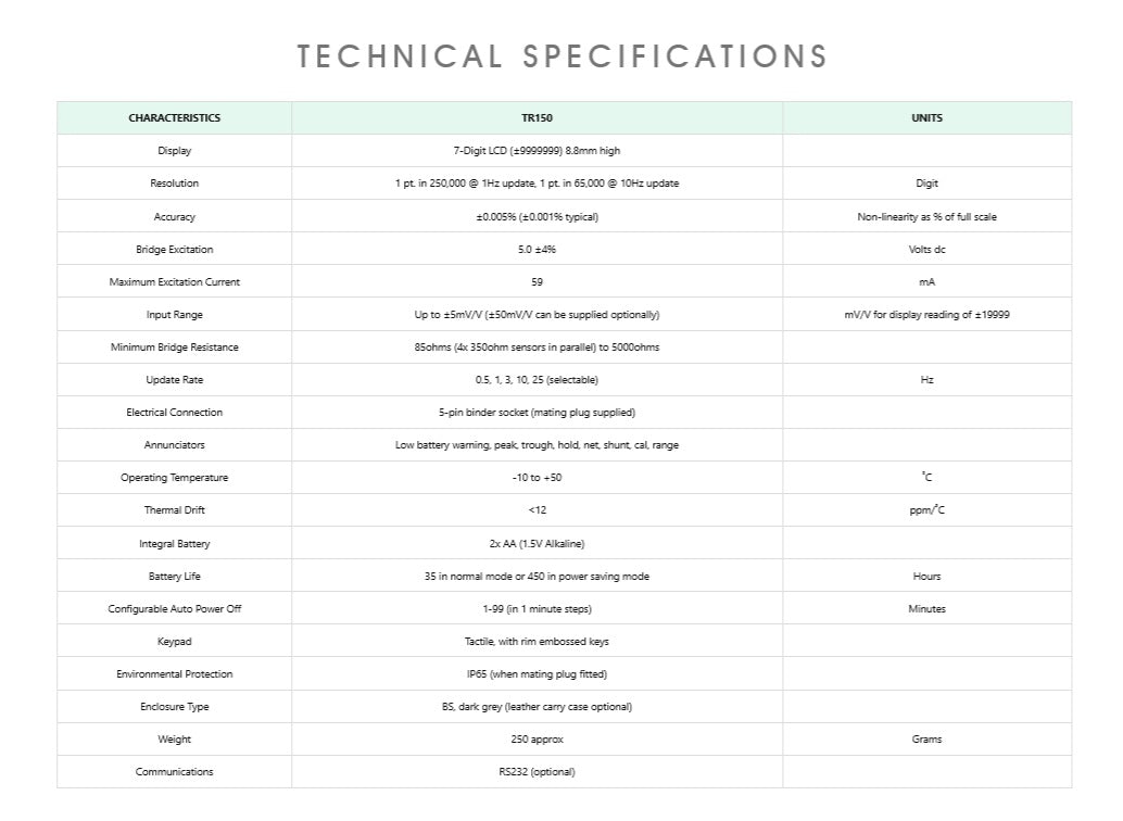 Designed with portability in mind, the TR150 operates from two standard AA batteries, delivering up to 450 hours of continuous use in low-power mode with a 350Ω bridge connected. Simple six-button configuration ensures fast setup without complex programming, while stable bridge excitation, excellent accuracy, and minimal thermal drift support consistent, repeatable measurements. Whether used for general industrial weighing, structural testing, or calibration tasks, the TR150 provides a dependable, easy-to-use handheld solution for professional load measurement applications.
